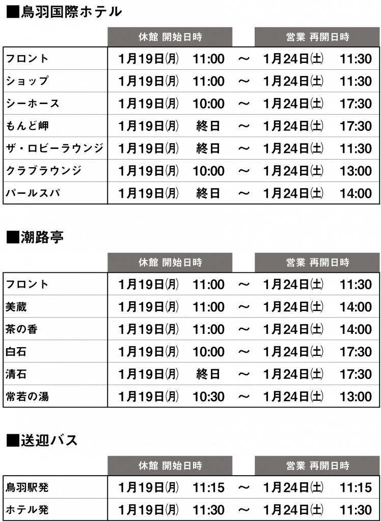 休業中は、宿泊、レストラン、ショップ等、全ての営業を休業させていただきます。期間中、皆様には大変ご不便をおかけいたしますが、皆様に安心安全のご滞在を提供するためでございますので、何卒ご理解賜ります様、宜しくお願い申し上げます。